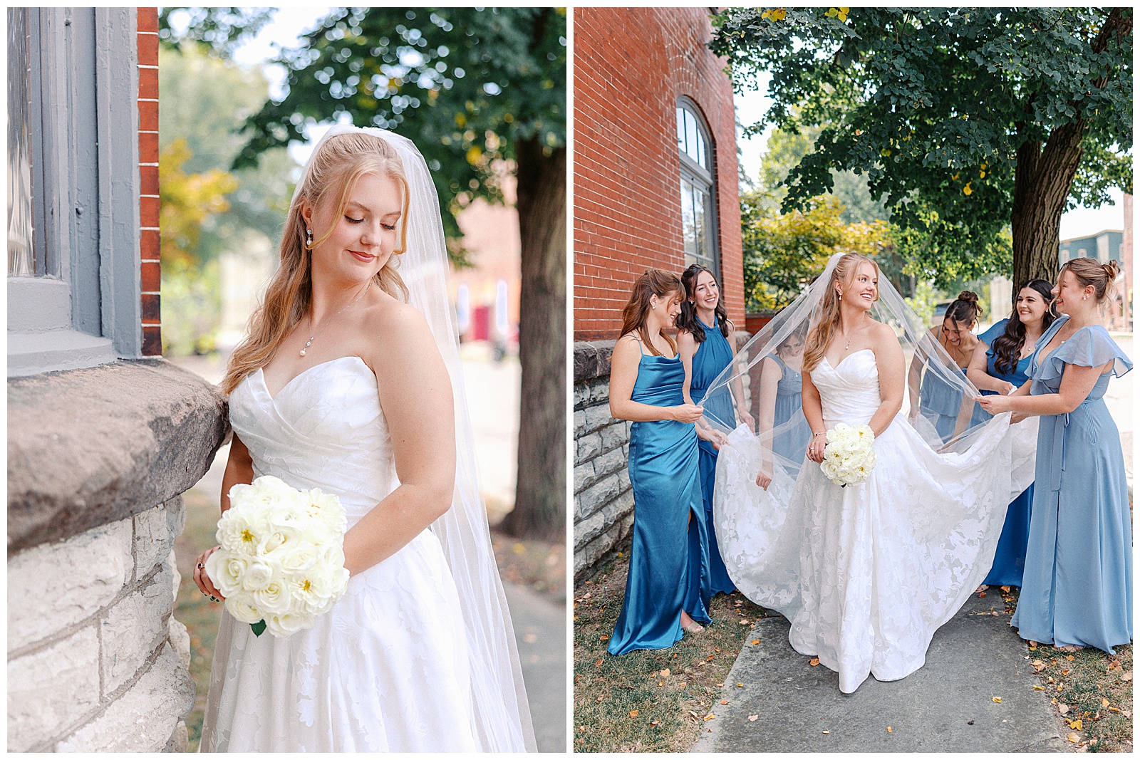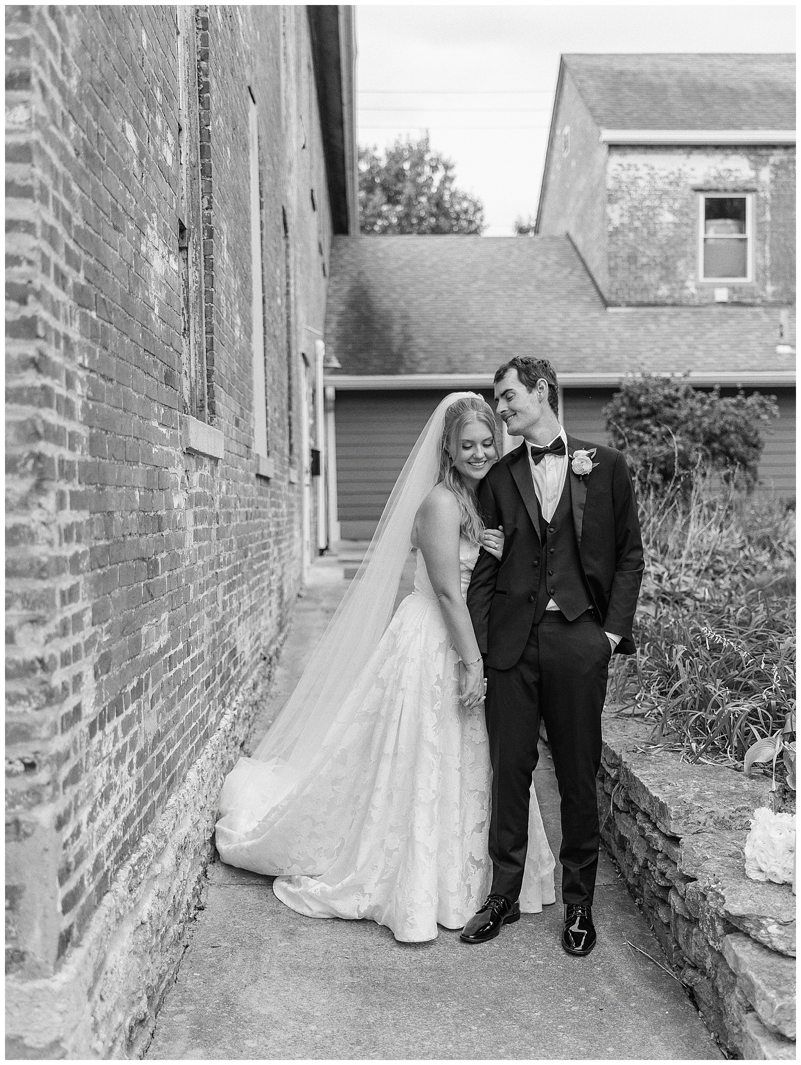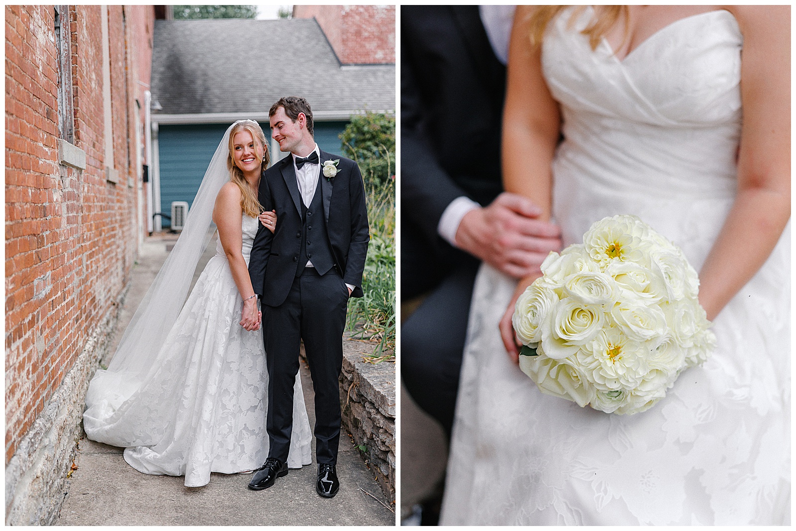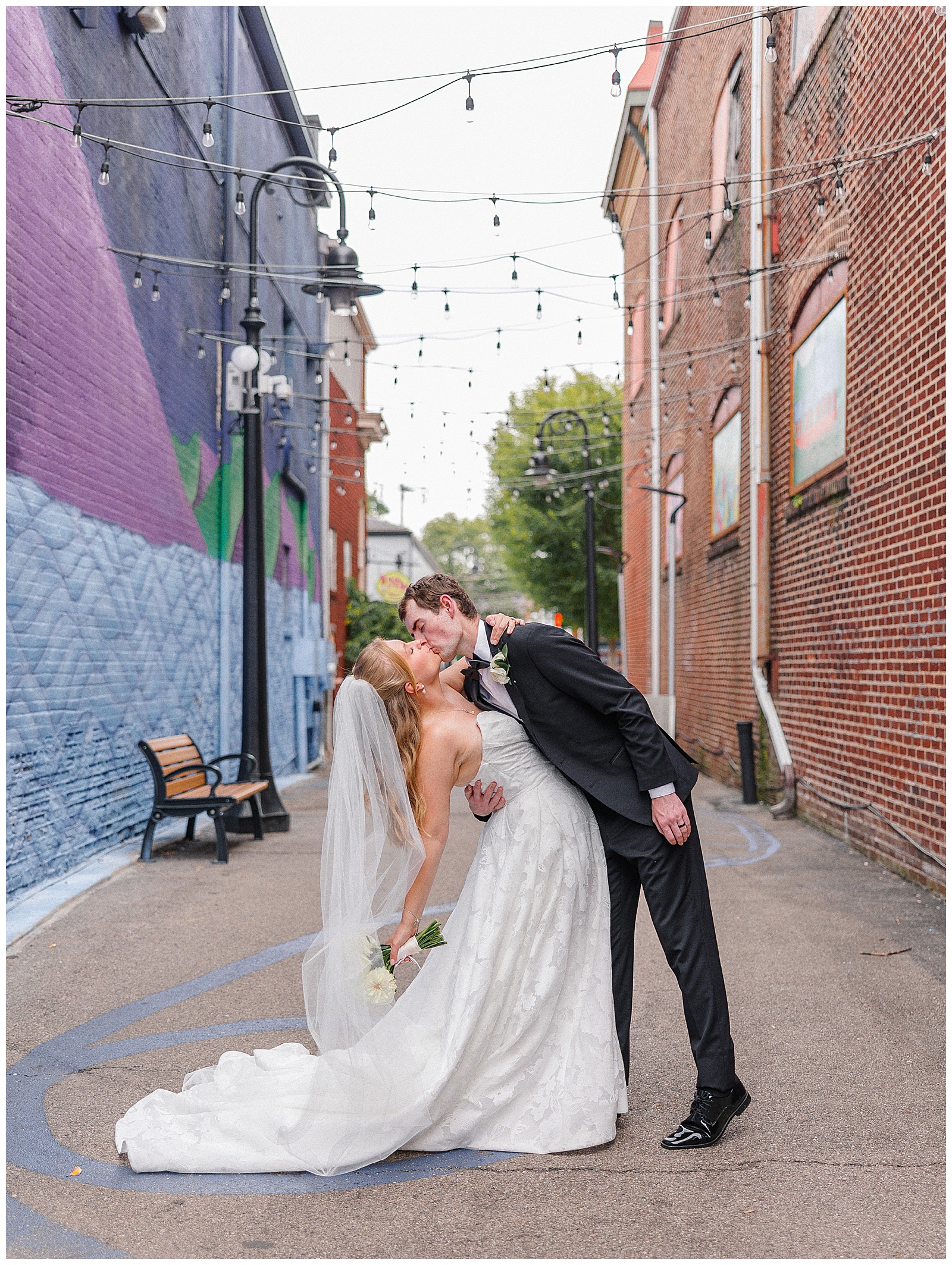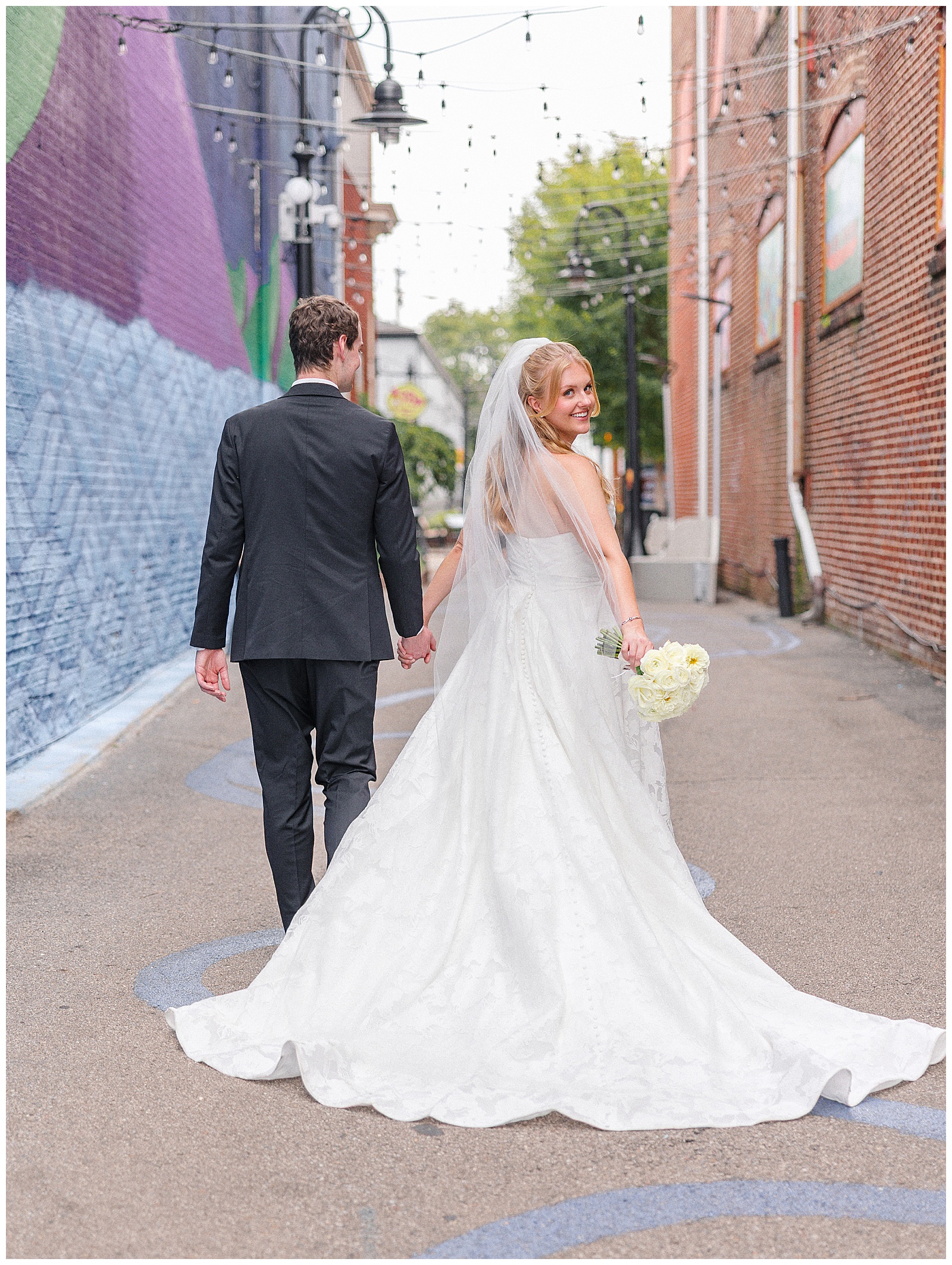 Jane and Graham were married at Our Lady of Good Hope Catholic Church in downtown Miamisburg. After the ceremony, we explored downtown Miamisburg for portraits. The colorful murals, brick alleyways, and twinkle lights provided such a fun backdrop for romantic photos. We also used a beautiful park next to the church for portraits. I always love it when there is a mixture of urban and nature settings so that we can get a great variety!