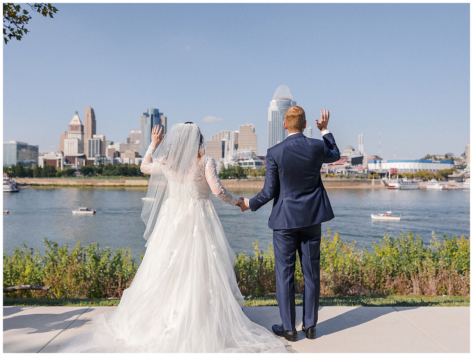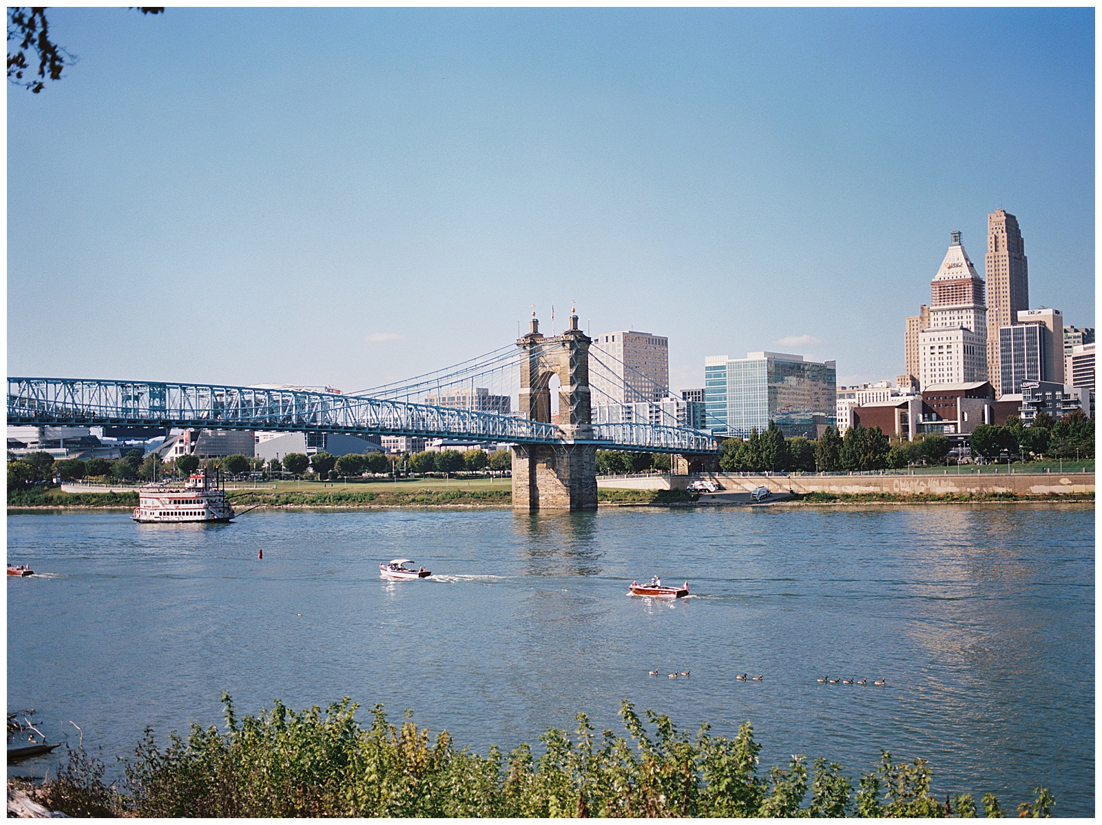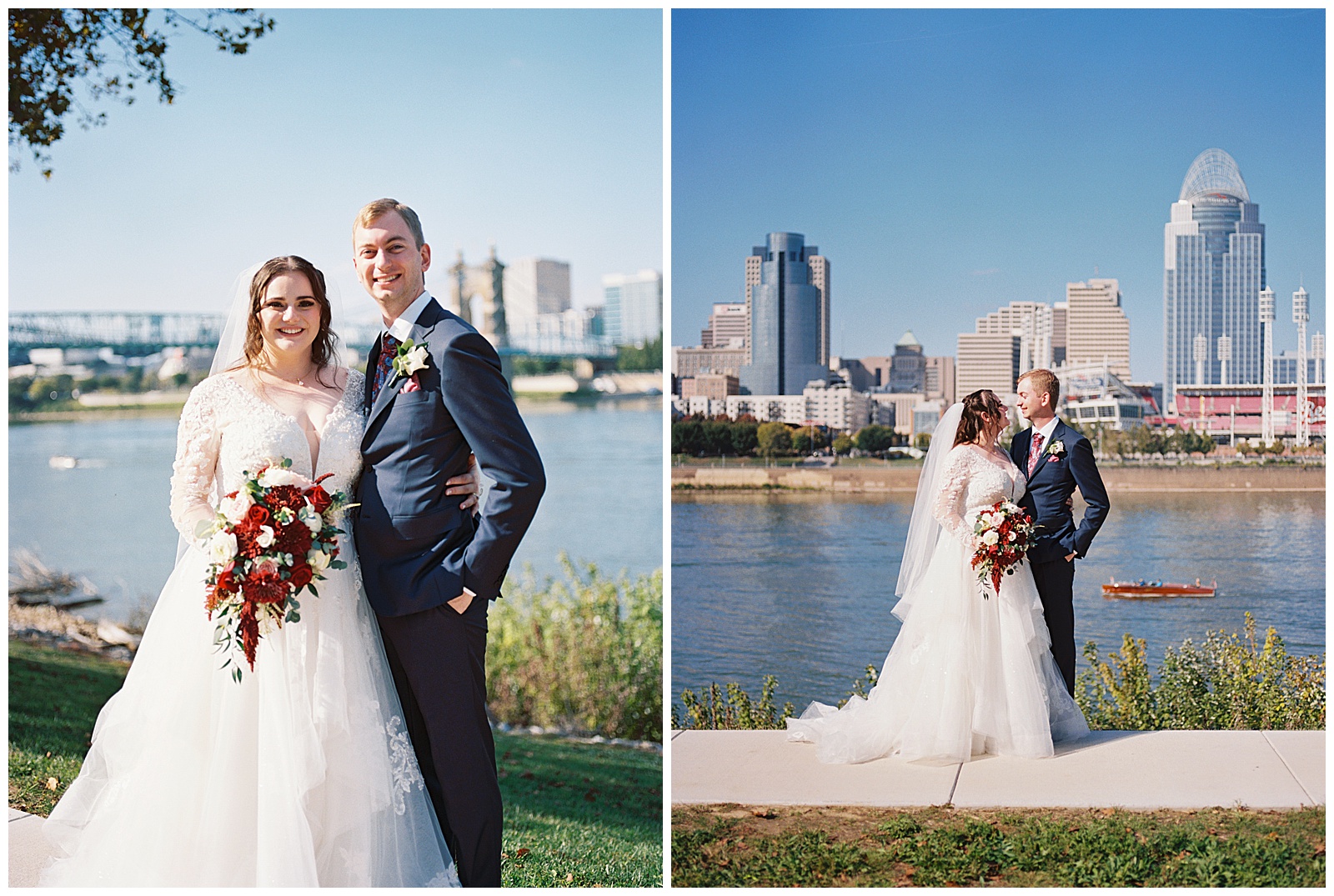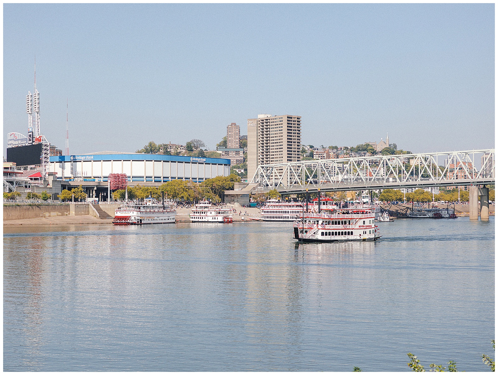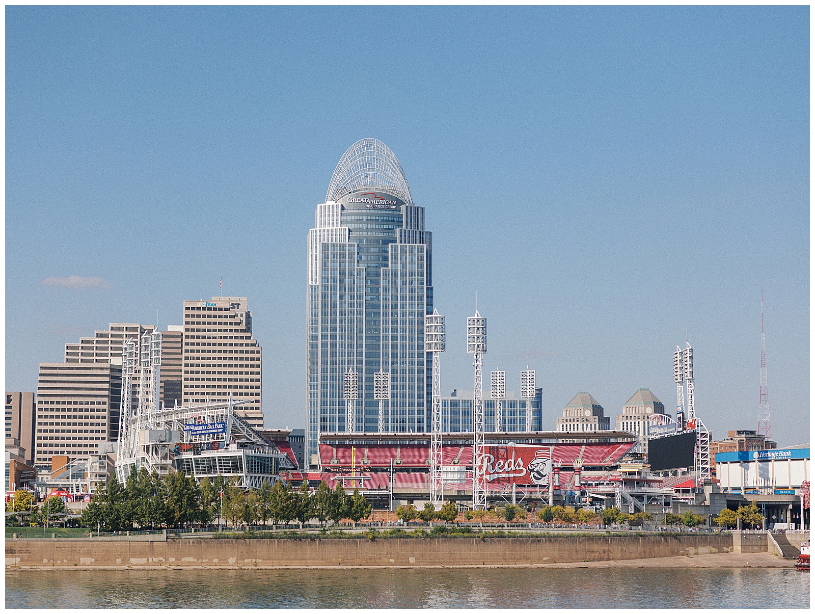After Mass, we captured portraits on the grand steps of the Cathedral, framed by its iconic columns. From there, we headed to George Rogers Clark Park, where the Cincinnati skyline provided the perfect backdrop. The America’s River Roots Festival was happening that weekend, and the river was full of boats — adding such a fun, lively energy to their portraits!
